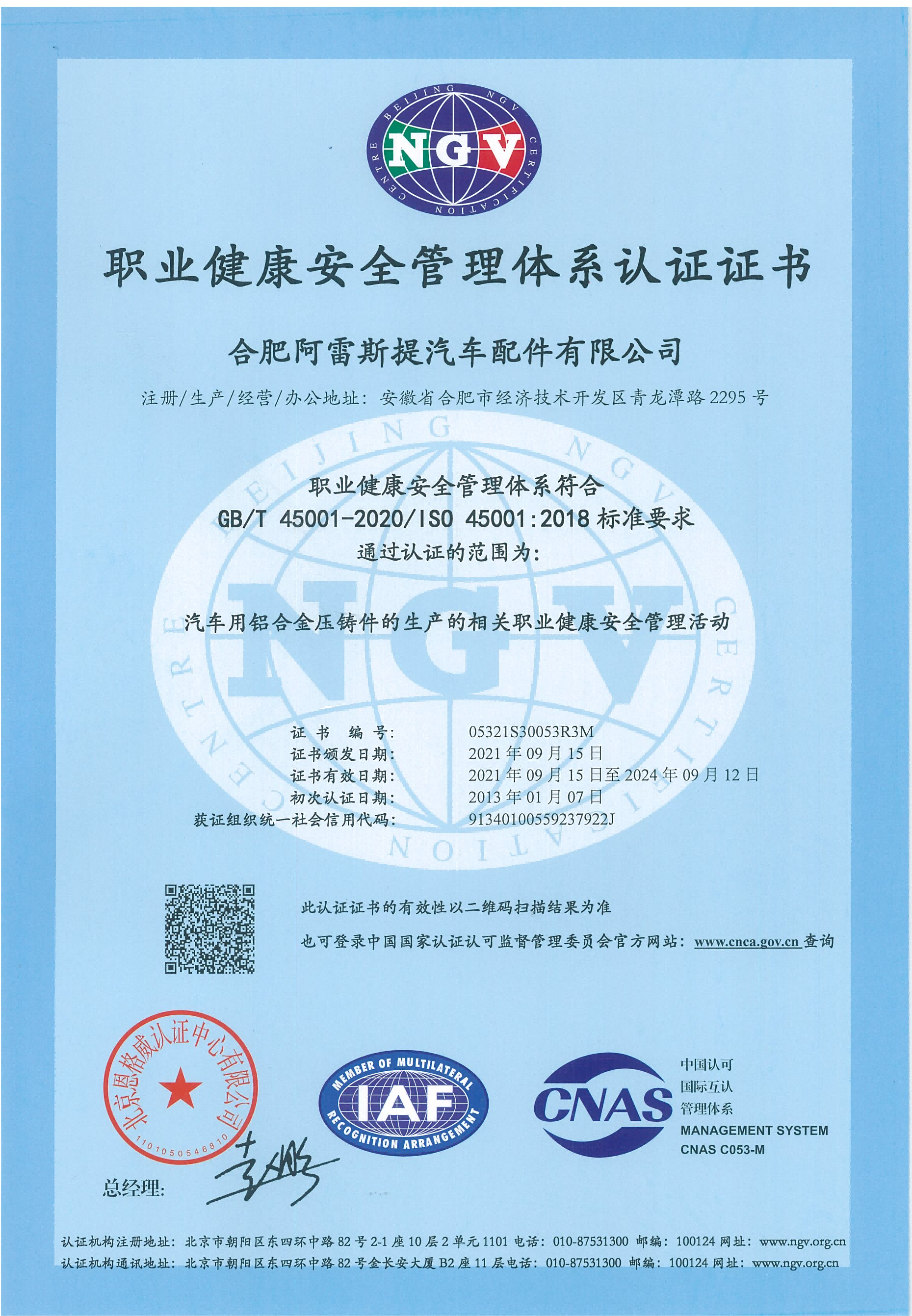 職業(yè)健康安全管理體系證書中文版