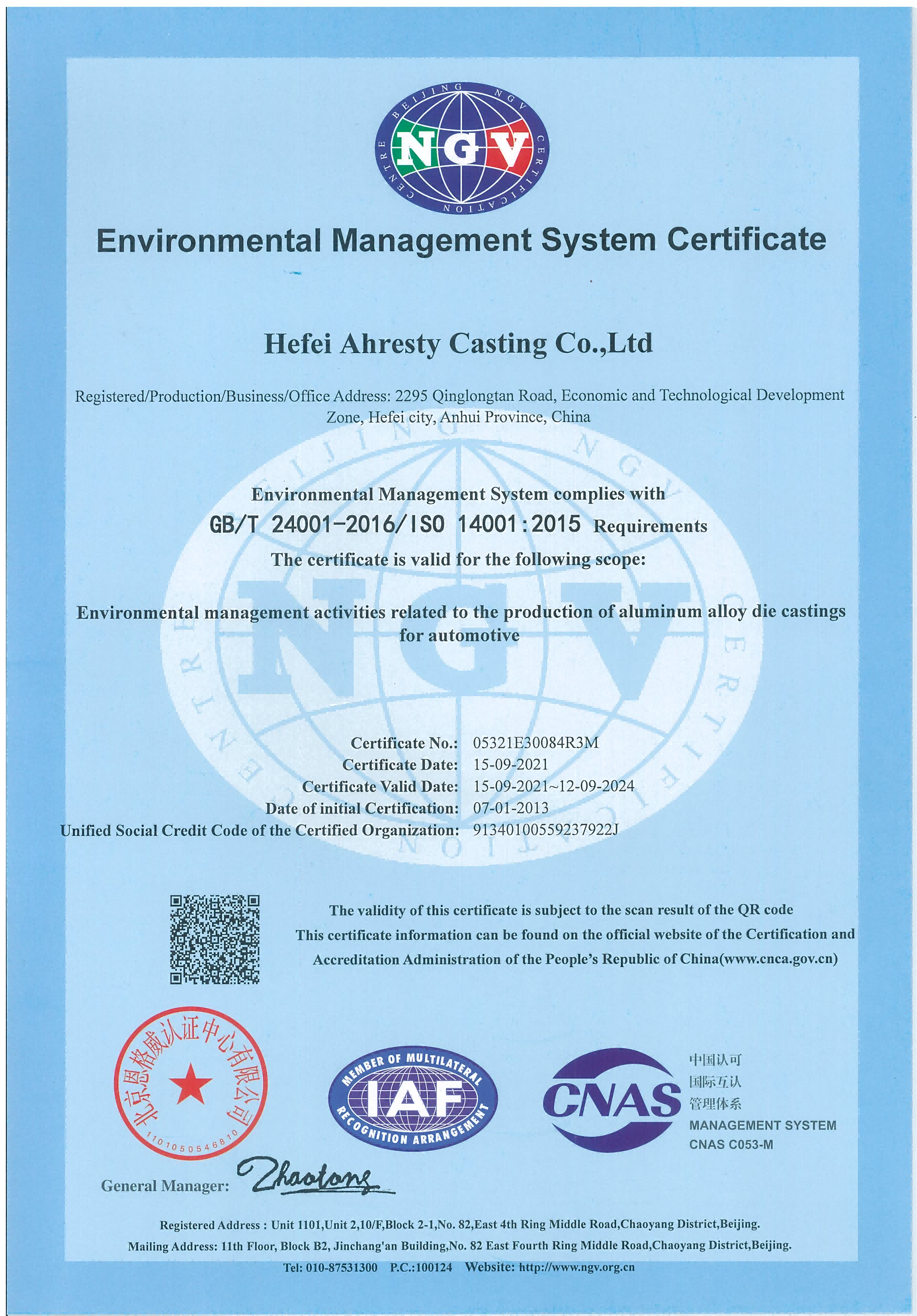 環(huán)境管理體系認證證書英文版